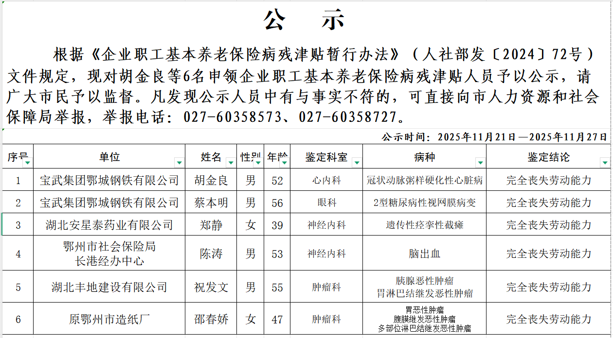 鄂州市2025年11月申领企业职工养老保险病残津贴人员公示