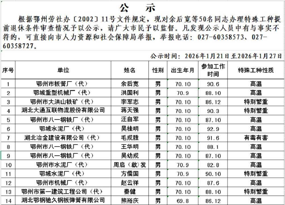 2026年1月特殊工种提前退休公示