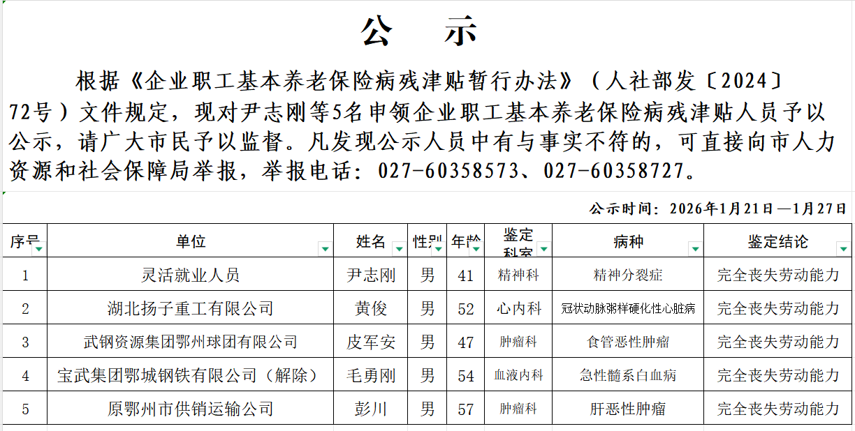 鄂州市2026年1月申领企业职工养老保险病残津贴人员公示