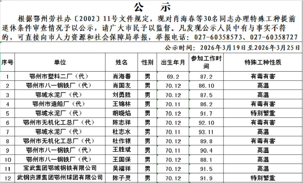 2026年3月特殊工种提前退休公示