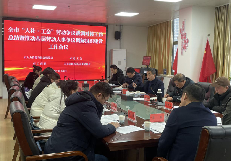 为进一步完善“人社+工会”劳动争议调裁对接工作机制,持续推进基层劳动人事争议调解组织建设,2月28日,鄂州市“人社+工会”劳动争议裁调对接工作总结暨推动基层劳动人事争议调解组织建设工作会议在市人社局召开。市人社局二级调研员王明祥,市总工会二级调研员姜剑鹏,市工商联党组成员、副主席盛以茂,市企业联合会秘书长汪建富出席会议并讲话。市仲裁院院长、各区人社局分管调解仲裁工作副局长以及区劳动人事争议仲裁院相关领导负责同志参加会议。
